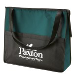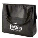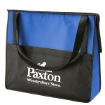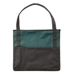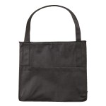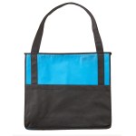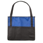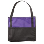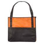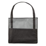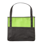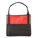 Constructed of 80 GSM non-woven polypropylene. Two-tone design with zipper closure on top. Includes wide black front pocket, spacious main compartment and 26″ black non-woven handles. 13″ H x 15″ W x 4″ D