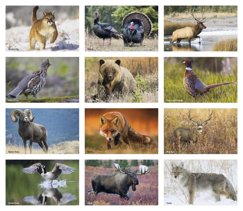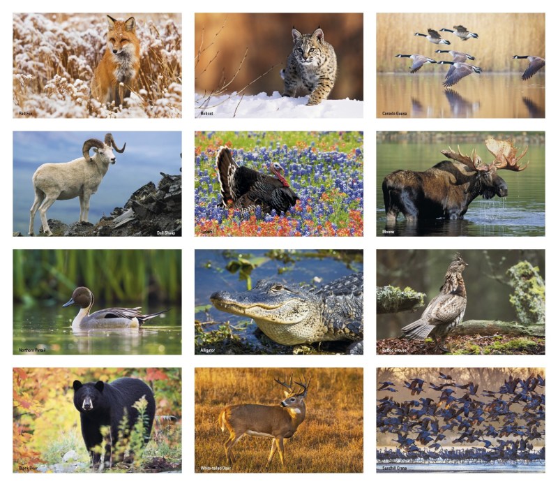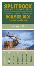 The Press-N-Stick Header Sportsmen Calendar (13-Month) features monthly images of game animals, with PRESS-N-STICKâ„¢ for easy mounting.