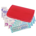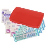 Ultra-trim case contains 4-latex-free bandages, 2-antiseptic towelettes and 2-first aid cream packets. 2 9/16″ W x 4 1/8″ H x 1/2″ D