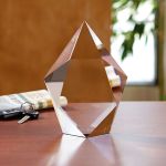 This piece was made for great dichroic reflections throughout the piece. You can see a rainbow of colors reflecting off the multi-directional facets. 5.75″ W x 7.875″ H x 1.625″ D