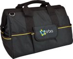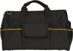 Made of durable and water-resistant 600D Polyester, features stable gatemouth design with heavy duty zipper with wide opening, wire reinforced rim, contains 12 inside tool pockets, 8 outside tool pockets plus an additional 2 hook and loop secured outside pockets, rubber feet for stability, removable adjustable shoulder strap for transport and padded handles for additional comfort. (Tools not included) Weight capacity: 33 lbs/15 kgs. 10″ D x 17″ W x 10″ H