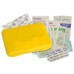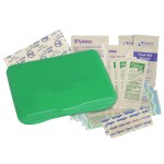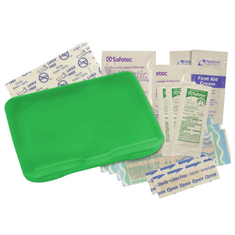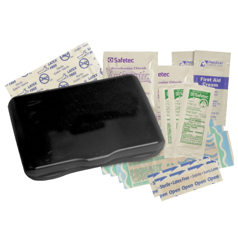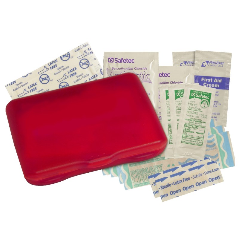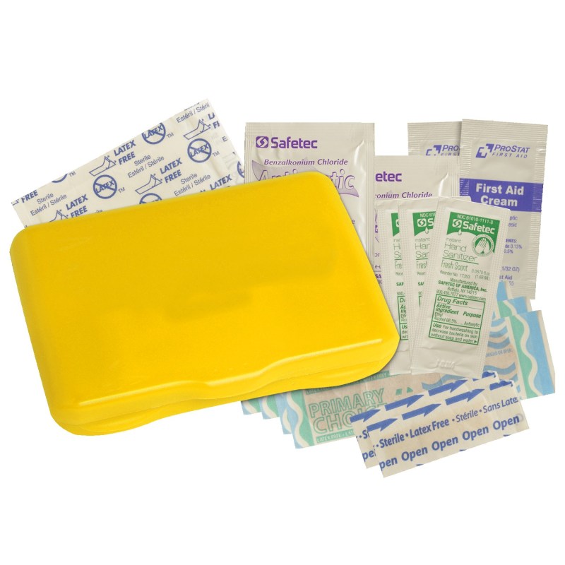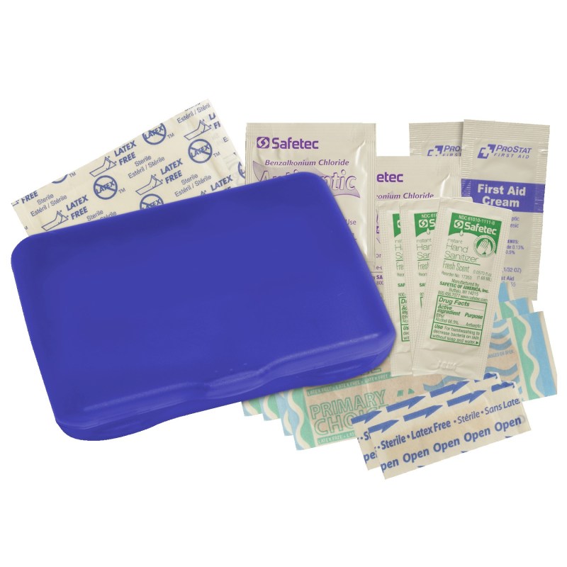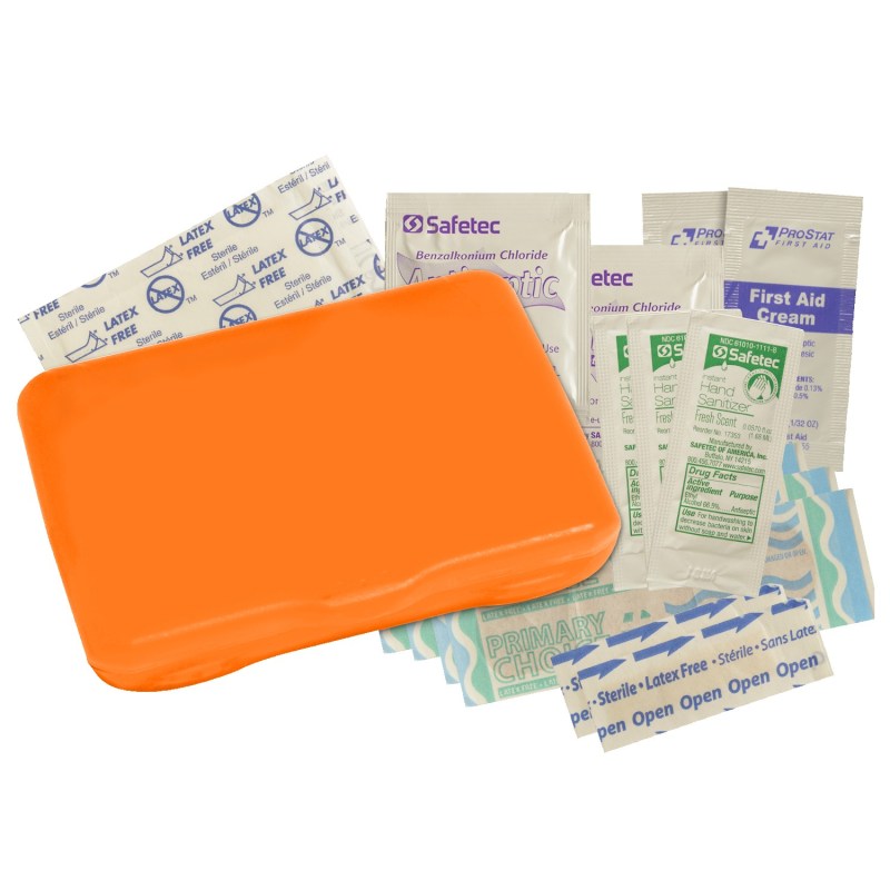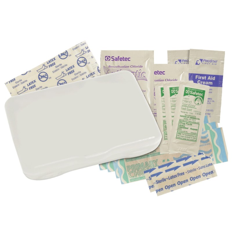 Contemporary case holds 4 latex-free bandages, 2 snip bandages, 2″x3″ adhesive pad, 3 antibacterial gel packets and instructions. Vibrant Full Color digital direct option available, see catalog for details. Complies with Prop 65. 3 1/8″ W x 4 5/16″ H x 13/16″ D