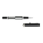 Screw-off cap design rollerball with mother-of-pearl and black onyx inlays, checkerboard pattern barrel and chrome trim. Complies with Prop 65. 3/4″ W x 5 5/8″ H x 9/16″ D