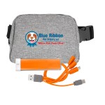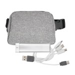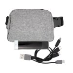 Eco-friendly Fanny Pack made from recycled materials with a sleek black adjustable strap. Includes a UL 1800 Providence Power Bank that is UL Certified for safety. Features a vibrant 4-in-1 charging cable with multiple USB adapters, perfect for all your charging needs. This innovative design is compatible with IOS devices, Micro USB, and Type C USB, all covered by a patented technology. Equipped with both USB and Type C USB inputs for maximum convenience. Complies with CE, cUL, FCC, Prop 65, UL, UN38.3. 7.25″ L x 2.15″ W x 5″ H