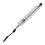 Combination Pen, Stylus and 2 sided pullout banner. Headphone jack attachment lets you attach the stylus to your phone or tablet.