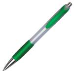 Plastic click-action ballpoint pen with colored trim and textured plastic comfort grip.