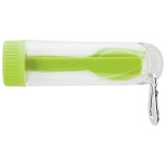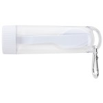 Cutlery set includes fork, knife and spoon in convenient durable ABS transparent storage case with handy 50mm aluminum carabiner. Complies with Prop 65. 2 1/8″ W x 5 13/16″ H x 1 3/4″ D