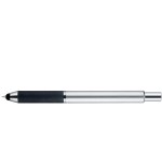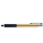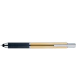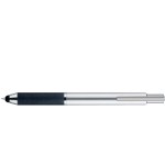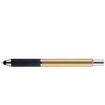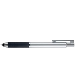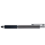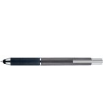 This metal pen features a retractable style with a straight metal barrel and satin finish. It has a grooved gunmetal design with a black soft grip, stylus, and chrome accents. The pen includes a medium point with smooth writing in black ink. With a sleek metallic barrel and satin finish, this premium pen offers a sophisticated look and feel. The ballpoint ink refill ensures consistent writing and the integrated stylus tip allows for touchscreen interaction. The textured grip provides comfort and control for extended writing sessions. Complete with a plunger for easy ink deployment and a secure pocket clip, this pen is stylish, functional, and durable for everyday use. Perfect for professionals and people on the go. Additional optional imprint locations are 1″x¼” inline with clip (screen printed), 2″x5/16″ right/left of clip (full color), 1¼”x¼” inline with clip (laser engraved), and 2″x½” (XL laser engraved). Complies with Prop 65. 5″ L x 0.4″ W x 0.6″ H
