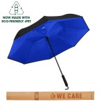 Now made with eco-friendly rPET polyester, the Rebel 2 is an inverted auto open, double canopy umbrella built with a 46″ arc, revolutionary inverted design, and a fiberglass frame. The Rebel 2 has a straight rubber grip handle. This umbrella is powered by our patented RainAlertz App, telling you when it’s going to rain. 46″ W x 34.5″ L
