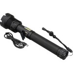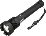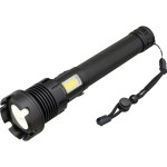 Bulb type: 20W XHP90 LED and COB Blue LED lights indicate battery level Approx 4 hours of charge time Output: up to 1200 lumens Aluminum body Main light modes (all white light): high, low, strobe Approx 1 hours of run time Features an adjustable light beam by push/pull focusing action Function button switches between main 20W light (1 click) and COB barrel light (2 clicks) Includes two rechargeable 18650 batteries, two plastic 18650 battery adapters, a USB Type-C charging cable, and an. 10.25″ D x 2.375″ W x 2.375″ H