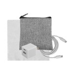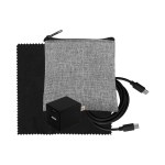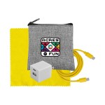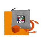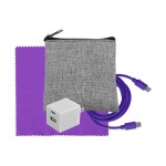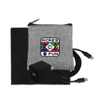 Introducing the sleek and eco-friendly Recycled PET zippered pouch. Elevate your charging game with the UL A+C Wall Charger, offering dual A and C outputs for ultimate versatility. Complement your setup with a vibrant 4-foot Type C to Type C charging cable. Ensure your devices stay pristine with the colorful 5 x 5 RPET Cleaning Cloth included in this bundle. Upgrade your charging experience with this chic and practical set that combines style and functionality seamlessly. Complies with CE, cUL, FCC, Prop 65, UL. 3.5″ L x 4″ H