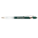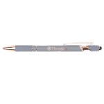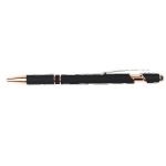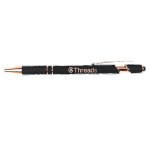 Crafted from recycled aluminum, this eco-friendly pen combines sustainability with sophistication. Its diamond-textured rubber grip ensures comfort and control, while rose gold accents add a refined touch. Featuring a stylus plunger and smooth hybrid ink, it’s the perfect pen for modern, sustainable branding.