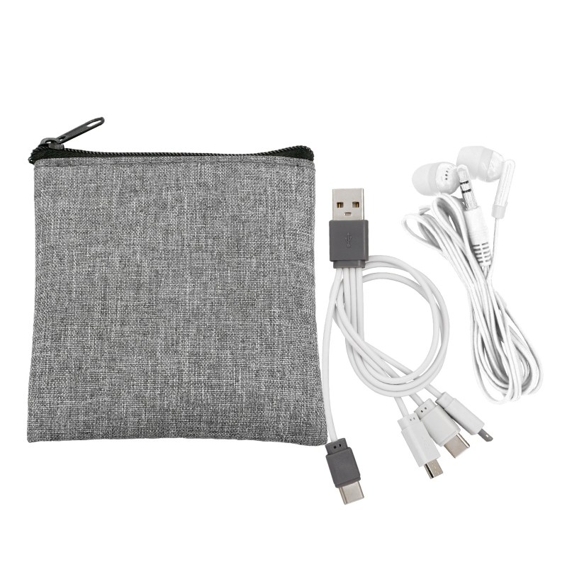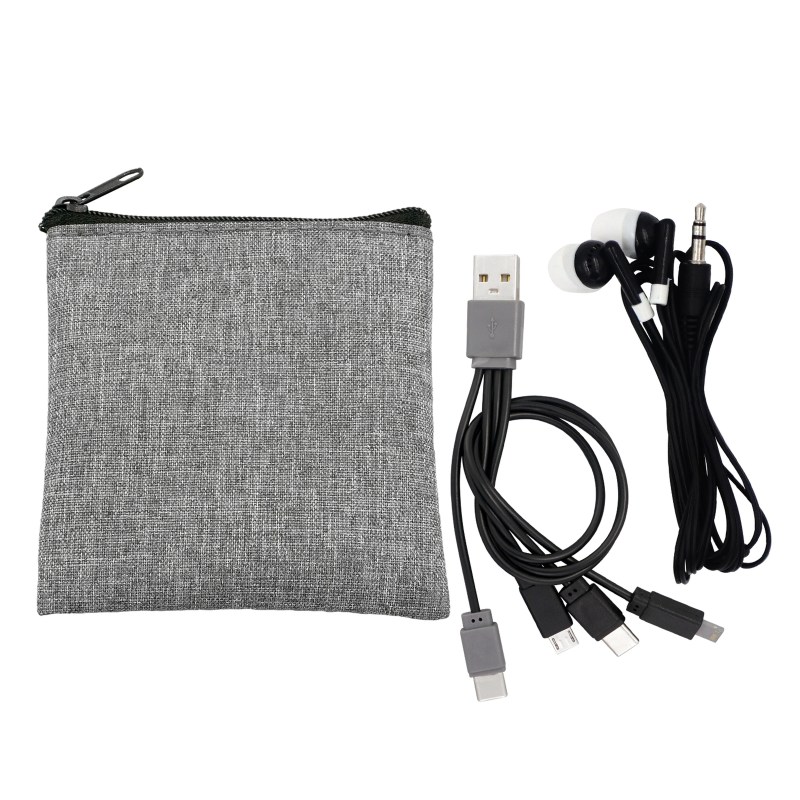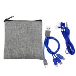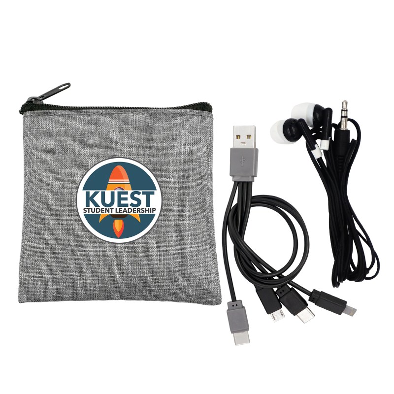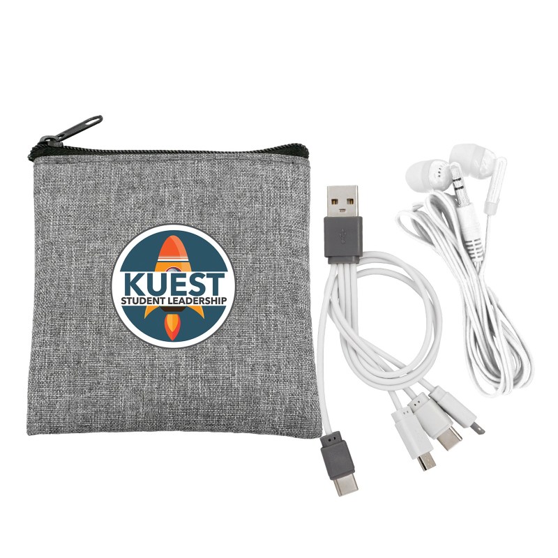 Recycled zippered pouch. Colorful travel ear buds. Colorful 4-in-1 charging cable; Multiple USB adapter. Compatible with 8-pin devices, Micro USB, Type C USB; Patented. USB and Type C USB input. Complies with CE, Prop 65. 3.5″ L x 4″ H