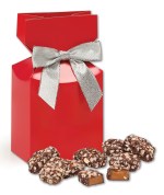 Our English Butter Toffee is crafted in small batches from a perfect blend of freshly toasted California almonds, sweet creamery butter and pure cane sugar. It is covered with a generous layer of rich milk chocolate and sprinkled with crushed almonds creating a buttery, crunchy, wonderful taste sensation. The red gift box is foil-stamped in your choice of gold or silver and tied with a matching bow. Complies with CPSIA, FDA, Prop 65. 6″ H x 3.5″ W x 2″ D
