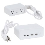 Upgrade your charging hub with our ABS fireproof AC outlet, 3 standard outlets, and 2 USB + 2 USB-C ports for 7-device simultaneous charging. A QR code is printed on each item providing access to the latest user manual. Flexible 5-ft cord, fast charging, and robust safety features. FCC and ETL certified for quality and safety. Elevate your charging experience! Complies with FCC, Prop 65. 4.75″ L x 2.5″ W x 1.875″ H