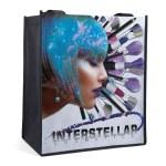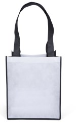 The 80 GSM Renoir PET non-woven bags feature white front and back panels, accented by black gussets, piping, and handles. An optional plastic bottom insert is available for purchase. Handles measure 1 1/2″W x 28″ long. 13″ W x 8″ D x 15″ H