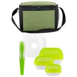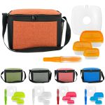 Elevate your lunch experience with the Ridge Lunch Cooler, complete with a convenient shoulder strap for easy carrying. Stay on track with your health goals using the Square Portion Control Containers, designed to help you maintain healthy portion sizes. The On The Go Cutlery Set includes a knife, fork, and spoon, ensuring you’re always prepared for any meal. Keep your food fresh and chilled throughout the day with the reusable ice pack included in this set. Perfect for busy individuals looking to enjoy a delicious and nutritious meal on-the-go. Complies with FDA, Prop 65. 9″ L x 7.5″ H x 8″ W