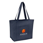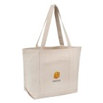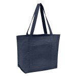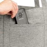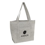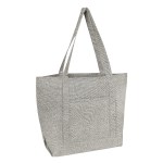 Made Of Combo 10 Oz. 80% Recycled Cotton Canvas And 20% Recycled Polyester. 320 GSM. Front Pocket. 27 ½” Handles. Spot Clean/Air Dry. 7″ D x 21″ W x 14″ H