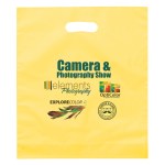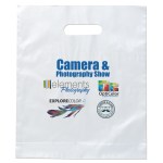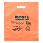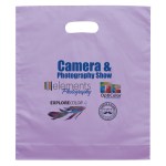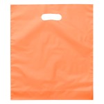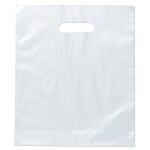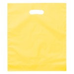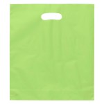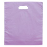 Colorful frosted hi-density plastic bag features die cut handles and a bottom gusset. 15″ W x 4″ D x 18″ H