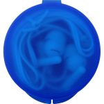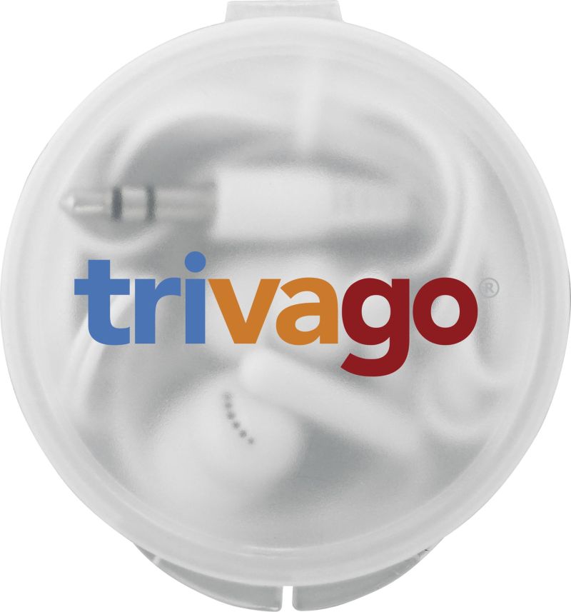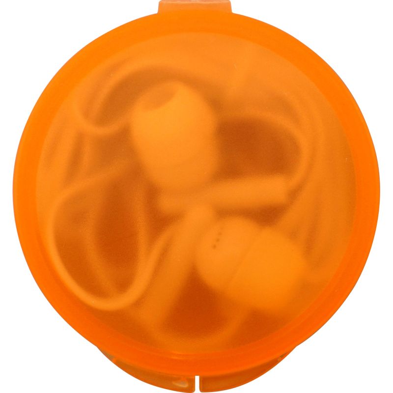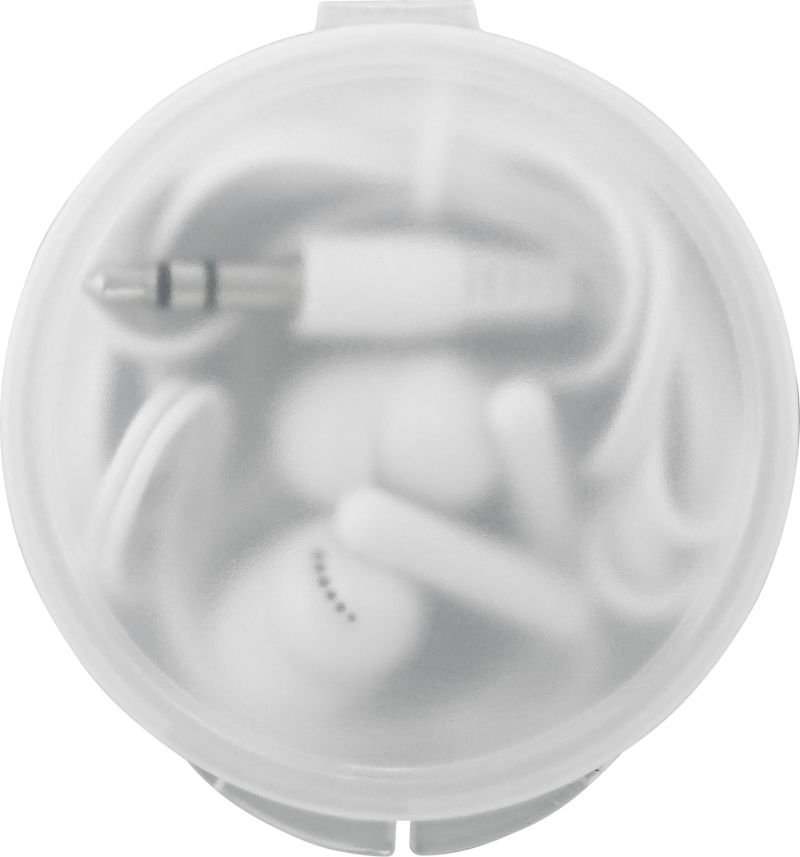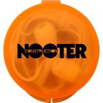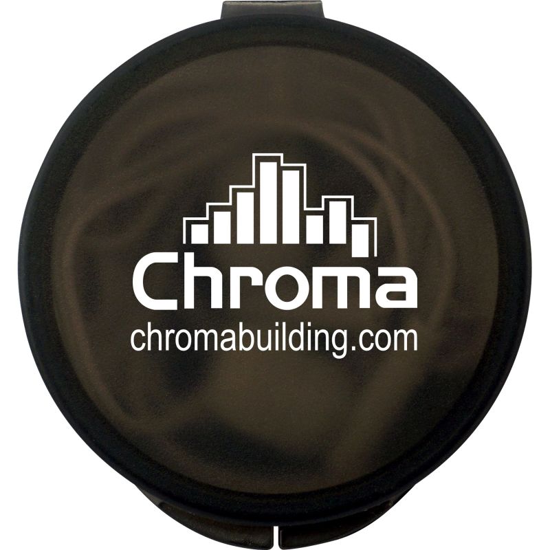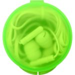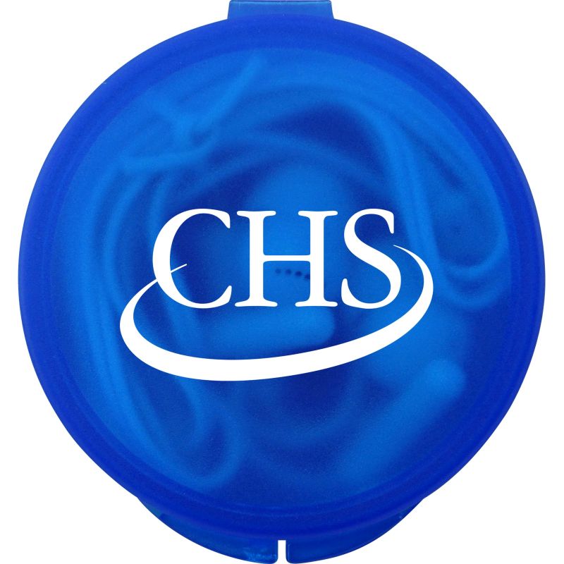 White travel ear buds in round container which can serve as a pill case. Ear buds included. Full color imprint available. No rush available for Full color imprint. Complies with Prop 65. 2″ D