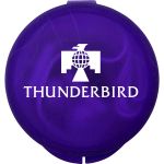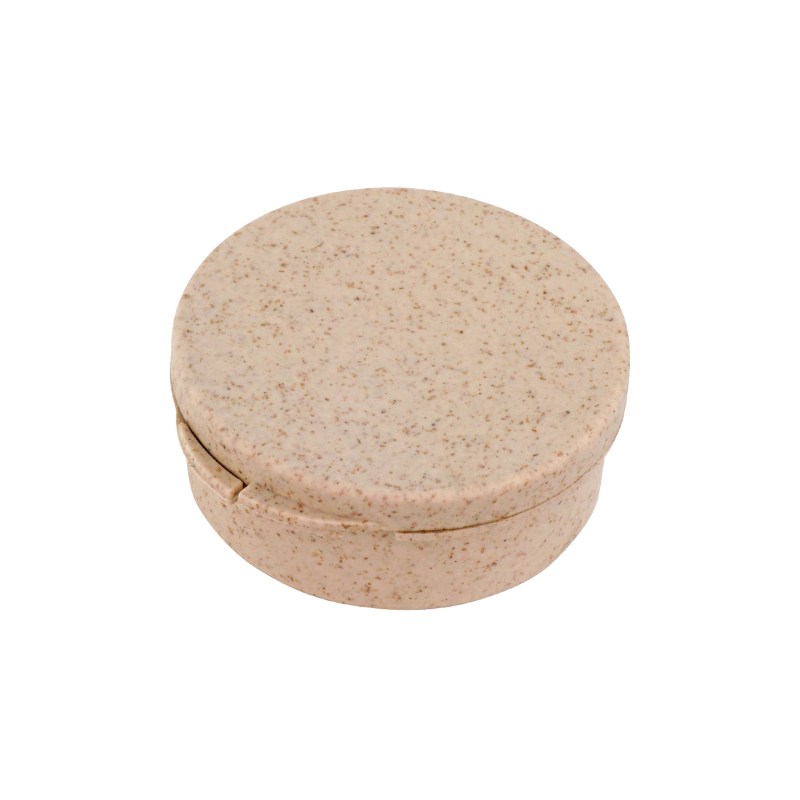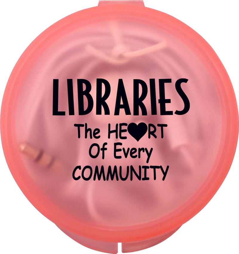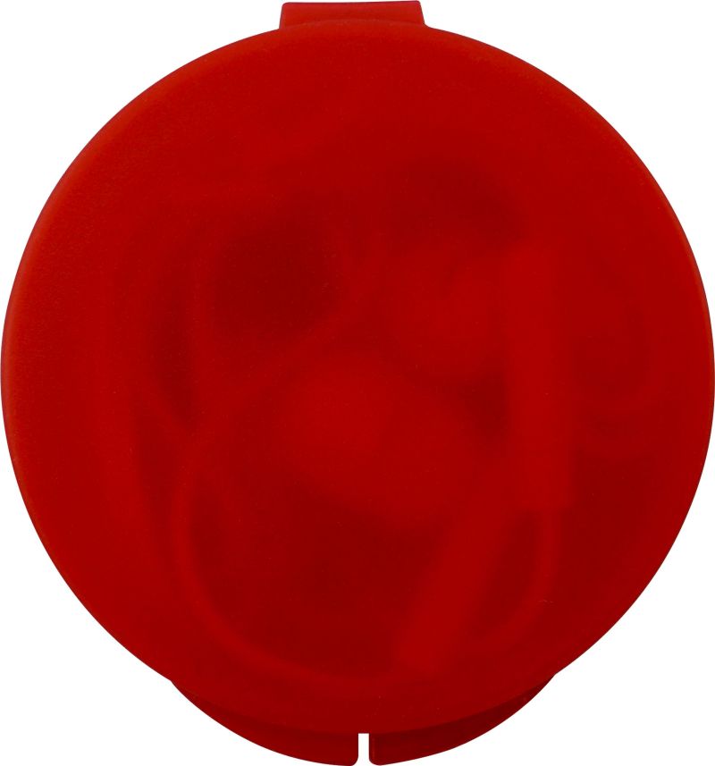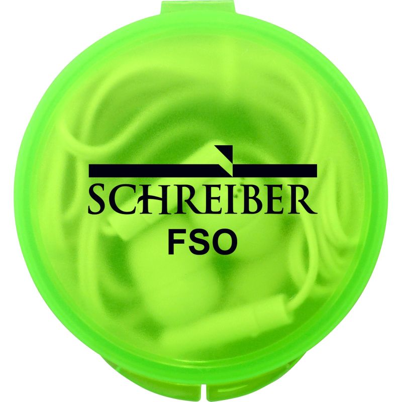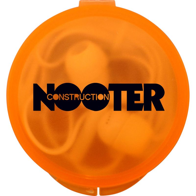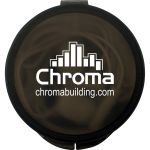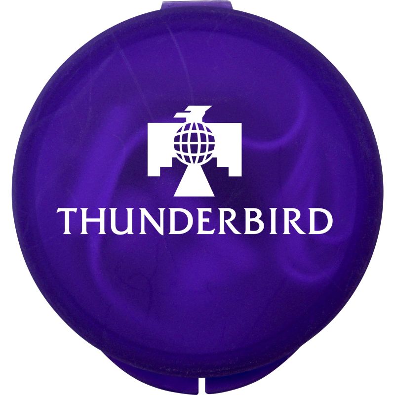 White travel ear buds in round container which can serve as a pill case. Ear buds included. Full color imprint available. No rush available for Full color imprint. Complies with Prop 65. 2″ D