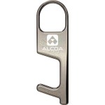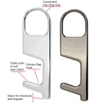 Introducing the ultimate everyday essential: a versatile tool designed for convenience and cleanliness. Say goodbye to unnecessary contact with our innovative keychain tool. Featuring a stylus for touchscreens, keypads, and elevator buttons, this tool goes above and beyond. Easily push or pull open doors without ever having to touch them. Need to carry groceries? No problem – our tool includes a handy bag hook for added convenience. Keep yourself safe from germs and bacteria by minimizing contact with surfaces. Stay protected and stylish with our sleek and practical tool. Complies with Prop 65. 4″ L x 1.25″ H
