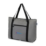 Compact travel, expanded. The RuMe(R) Recycled cFold Travel Tote folds into itself for easy storage, then opens to offer extra space for weekend trips, gym sessions, or carry-on use. Made with recycled materials, it features a reinforced bottom and a back sleeve that slides over luggage handles for effortless travel. Machine washable. Complies with CPSIA, Prop 65. 6.75″ W x 15″ H x 20″ L