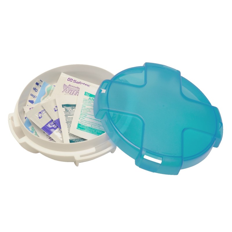 This first aid kit has a unique safety cross design that will help your message stand out. The water resistant case includes 6 latex free bandages, 2 2″x3″ adhesive pads, knuckle bandage, 2 first aid cream packets, 2 antiseptic towelettes, antacid packet, 200 mg ibuprofen packet and gauze roll. Features a push in and turn opening, similar to medicine bottle. Complies with Prop 65. 1 3/4″ W x 5″ H