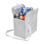 The Sami Box Cooler combines everyday function with a subtle flecked design made from recycled laminated nonwoven material. With a wipeable PEVA lining, adjustable shoulder strap, and front slash pocket, it’s perfect for carrying up to 10 cans. A flap closure with hook-and-loop fastening lets you adjust the height to fit your load, making it a versatile cooler for daily outings. Complies with CPSIA, Prop 65. 6″ W x 9.25″ H x 10″ L
