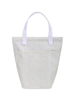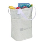 The Sami Cooler Collection features recycled laminated nonwoven material with a fashionably subtle fleck detail. Wipeable and durable PEVA lining. Hook and loop closure. Front slash pocket. Dual tote-style handles for easy carrying. One color screen print only. Holds 10 cans. Complies with CPSIA, Prop 65. 7.25″ W x 12.5″ H x 13″ L