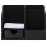 Executive desk box with 100 page paper pad, contrast stitching, letter holder, hide-away drawer, pen cup, phone / card holder with hidden slots for charging cables. Complies with Prop 65. 6 1/2″ W x 5 1/4″ H x 5 7/8″ D