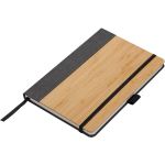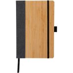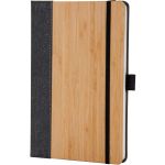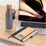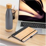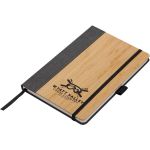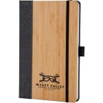 The Saratoga Horizon Bamboo & Leather Journal Checks all the Boxes! Eco-Friendly, Trendy and Useful! The cover is made of natural FSC certified bamboo with a recycled leather accent. High environmental and socially responsible forestry. Matching elastic loop closure, ribbon bookmark and elastic pen loop. 80 sheets of lined recycled paper and a back document pocket. Add your custom logo or message. Complies with Prop 65.