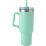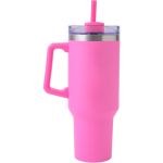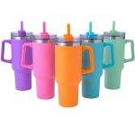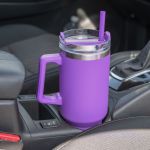 Stylishly Insulated: Our 40 oz Satisfy Brite Tumbler keeps your drinks at the perfect temperature. Cup holder-friendly and crafted from stainless steel – your ideal daily companion!. Bright Powder coated finish travel mug with ergonomic comfort handle, polypropylene straw and screw-on lid. 18/8 Stainless Steel double wall thermal mug with copper vacuum insulation. It keep drinks cold for up to 30 hours, hot for up to 12 hours. 40 oz. capacity offers maximum hydration with fewer refills. Complies with Prop 65. 3.86″ D x 2.9375″ D x 12.3″ H