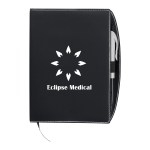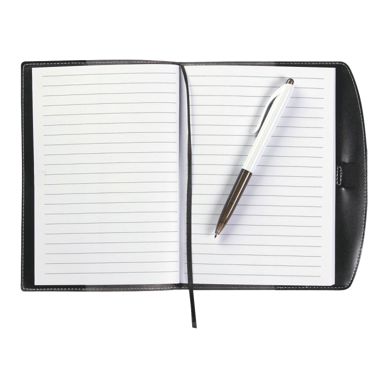 80 Page Lined 5″ x 7″ Notebook. Bookmark And Elastic Pen Loop With Matching Pen. Polyurethane Cover. Complies with Prop 65. 6″ W x 7.5″ H