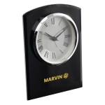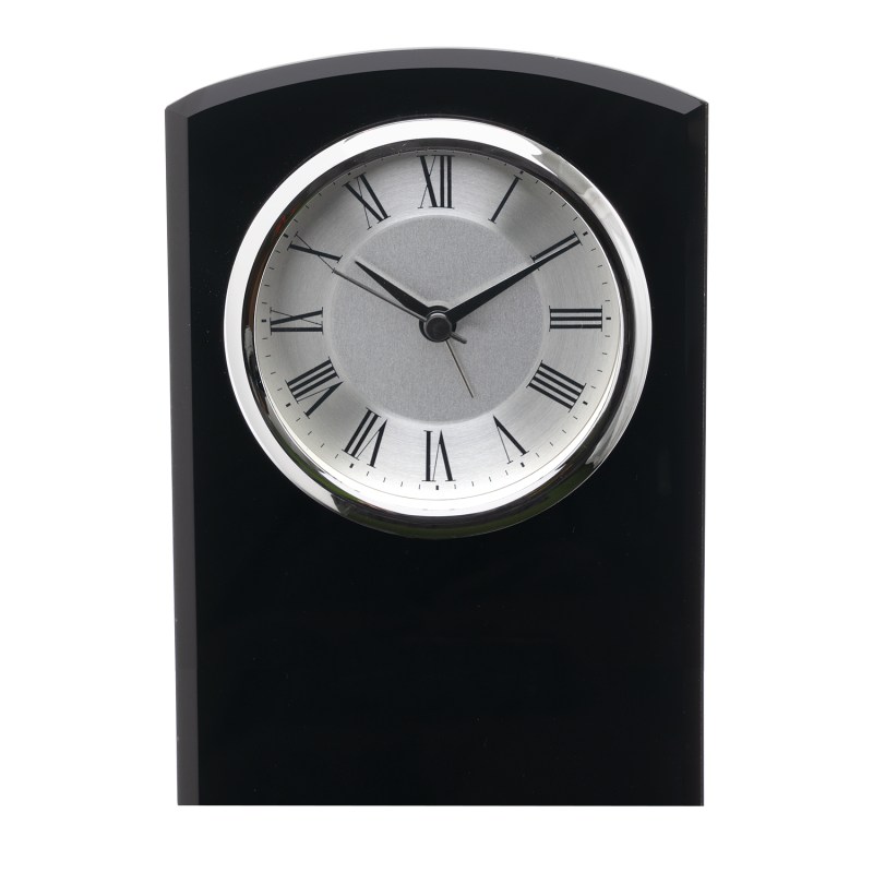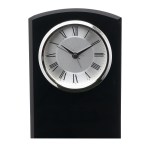 This stylish black gloss alarm clock has an easel base with a silver dial. AA battery included. 4.5″ W x 7.125″ H x 1.9375″ D