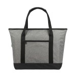 The Shoreline Cooler Bag is the ideal companion for a quick picnic to the park for the whole family. The outer fabric is sustainably made from recycled water bottles (RPET) and the spacious interior is lined with thick foam and heat-sealed PEVA lining. It also features an interior zippered mesh bag to hold keys or small items, a front zippered pocket, and reinforced carry handles. The Shoreline RPET 24-Can Cooler is an ideal gift option that combines functionality and affordability. Complies with Prop 65. 15 1/2″ W x 14″ H x 7 1/2″ D