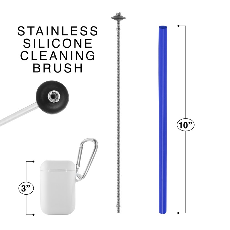Silicone straw with brush. 10″ Bendable silicone straw. Hard plastic 3″ storage case. Stainless steel cleaning brush. Carrying carabiner. Straw has 3/8″ jumbo opening. Complies with ASTM, CPSIA, C-TPAT, FDA. 9.85″ L