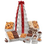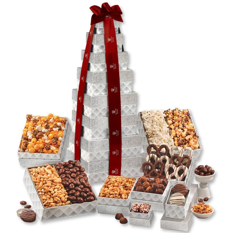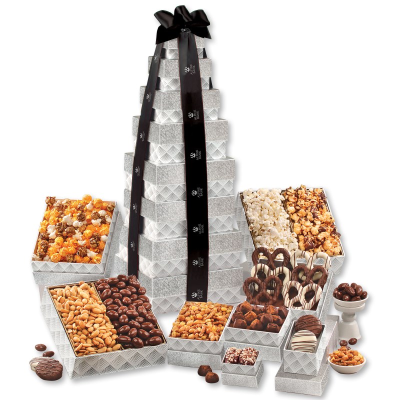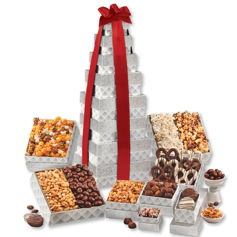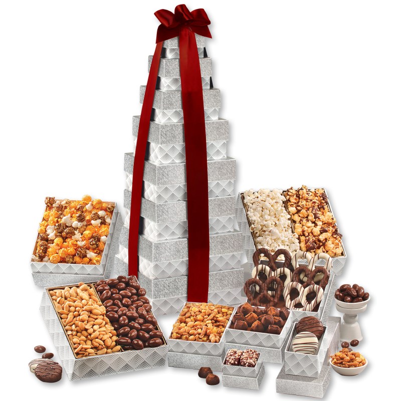 Our tallest tower ever! At nearly two feet tall, your customers will be thrilled to receive this wonderful gift! This giant tower features eight boxes filled with eleven different gourmet delights, including a selection of gourmet popcorns, sweet and salty chocolate dipped pretzels, and our world-famous chocolate covered almonds. Serves 14-18. Complies with CPSIA, FDA, Prop 65. 8.125″ L x 7.25″ W x 23.625″ H