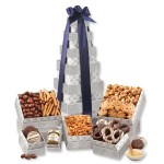 This silver tower is nearly overflowing with an expertly-balanced combination of sweet and savory flavors to satisfy every recipient. It features an assortment of traditional and new favorites, including our world-famous chocolate covered almonds, bite-sized chocolate chip cookies, and seasoned dipping pretzels complete with gourmet mustard. This scrumptious selection is packed in reusable boxes that are tied together with ribbon foil-stamped with your logo. Serves 10-12. Complies with CPSIA, FDA, Prop 65. 6.5″ L x 5.75″ W x 15.75″ H