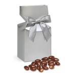 These Chocolate Covered Almonds are made with real cocoa. By combining the rich flavor of premium chocolate with toasted California almonds that are high in fiber and loaded with vitamin E, we’ve created a delicious healthy snack that you can enjoy without feeling guilty. Each box contains five-ounces. Silver gift boxes are foil-stamped with your logo in black and are complete with a silver bow. Complies with CPSIA, FDA, Prop 65. 6″ H x 3.5″ W x 2″ D