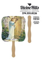Stay cool and spread your message with this beautifully designed hand-held paper fan featuring an uplifting image on the front and your imprint on the back. Perfect for so many occasions, it combines practicality with a meaningful message, adding elegance to your event while keeping attendees feeling refreshed. The FSC® label means that the materials used for this product come from well-managed FSC®-certified forests and other controlled sources. 7.5″ W x 7.75″ H