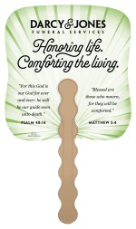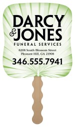 These paper fans feature a green palm leaf pattern with a subtle sunburst effect, offering a sophisticated touch to the design. Your custom imprint in black ink stands out clearly, making these fans both practical and stylish for events, churches, memorial services, and more. The FSC® label means that the materials used for this product come from well-managed FSC®-certified forests and other controlled sources. 7.5″ W x 7.75″ H