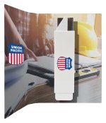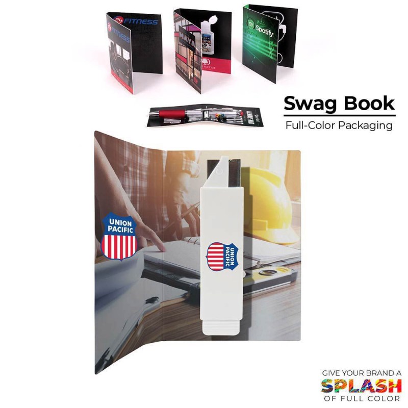 It’s made of ABS plastic, measures 4″ x 1″, comes in several fantastic colors, and features a retractable stainless steel blade that locks into place. This is perfect for getting into packages or tearing down big boxes for recycling. Not to be used by children. Digital Direct imprinting process allows for full-color impressions. Swag Book does not include the product. 3rd Imprint option: (Optional – Medium Swag Book): 3 1/4″w x 4 1/4″h. Complies with Prop 65. 4″ W x 1″ H