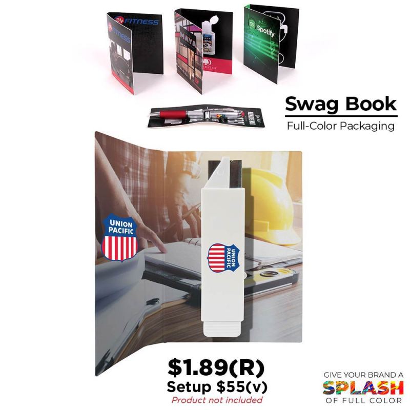 It’s made of ABS plastic, measures 4″ x 1″, comes in several fantastic colors, and features a retractable stainless steel blade that locks into place. This is perfect for getting into packages or tearing down big boxes for recycling. Not to be used by children. Digital Direct imprinting process allows for full-color impressions. Swag Book does not include the product. 3rd Imprint option: (Optional – Medium Swag Book): 3 1/4″w x 4 1/4″h. Complies with Prop 65. 4″ W x 1″ H