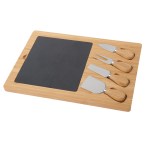This cheese board set includes a bamboo wood tray, a removable slate serving block, a cheese fork, a spade, and two flat knives. Great for picnics or parties. 13 3/4″ H x 9 7/8″ W x 1″ D