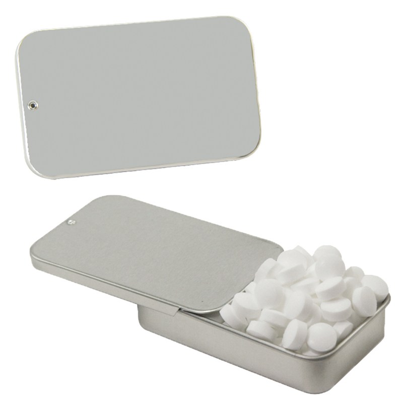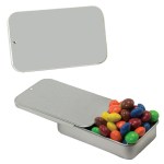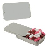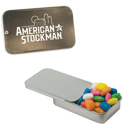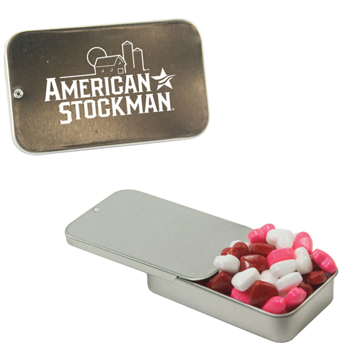 Tin Made In China, Candy Made And Filled In USA Unique Slider Tin Filled With Your Choice Of Mints, Candy Or Gum. Complies with Prop 65. 1 5/8″ W x 2 3/4″ H x 5/8″ D