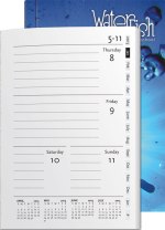When you need your planner to have the look and feel of a retail book, opt for the PerfectBook and leave the wire behind. These sleek books feature a flat, book-bound spine that can be imprinted all the way around with your art. This is the 4×6 version, but it is also available in a 5×7. This weekly planner has a Full-Color Wrap Cover on White Linen Stock. Made in the USA. Complies with FSC. 4″ W x 6″ H