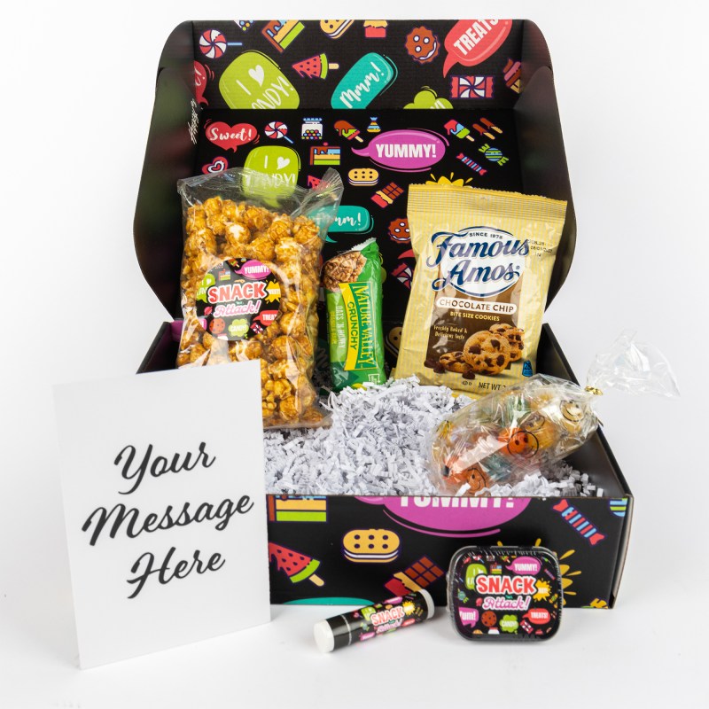 Set Includes #MS22 Mug Stuffers, #GPS Gourmet Popcorn Single, #ST02 Small Tin, #GRANOLABAR1 Individually Wrapped Granola Bar, #LB0 Lip Moisturizer, Famous Amos Chocolate Chip Cookies, Crinkle Paper And Customizable Card.