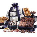 “It’s better to give than to receive,” as the saying goes; but this tower is a great argument for the opposite! It’s the perfect way to send your greetings, say “Thank you”, or show your appreciation! This tower holds the most sumptuous treats one could ever desire. We start with our signature English Butter Toffee, Cocoa Dusted Truffles, Chocolate Covered Almonds, and Chocolate Sea Salt Caramels; then add Chocolate Sea Salt Caramel Corn and Jumbo Pretzels dipped in Chocolate – 2 Milk and 1 White. A navy ribbon foil-stamped in silver with your logo ties it all together. Serves 18-24. Complies with CPSIA, FDA, Prop 65. 7.375″ L x 7.375″ W x 6.75″ H
