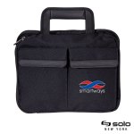 Solo New York netbook case features a padded main compartment that holds most netbooks and tablets up to 11.6″ and a fully lined interior. Lay-flat design separates tablet or netbook from accessories and meets Travel-Sentry checkpoint-friendly requirements to allow clear CheckFast x-ray scanning. Front zippered compartment allows storage of travel documents or other items. Two exterior accessory pockets with hook and loop closure provide storage for power cord, cell phone, and extras. Use retractable handle to carry the netbook case. Complies with Prop 65. 12″ W x 9 1/4″ H x 2 1/2″ D
